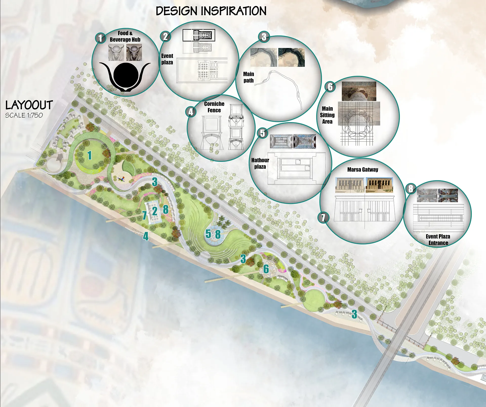 The conceptual kernel of the proposed design was the combination of contemporary design orientation and historical character. Through this concept which aims to combine the contemporary orientation design with the distinctive historical character of the city, through a set of design principles that reflects the special character of Qena, as follows: The ancient Pharaonic history, The morphology of the city, The main spaces and the Nile anchors have Formed an axis towards the Dendera Temple.